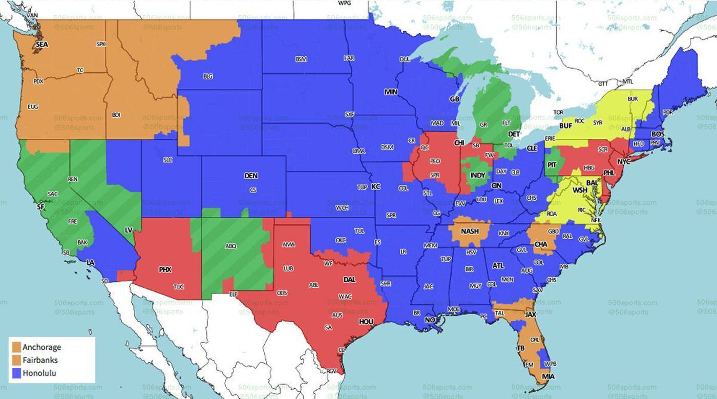 Week 9 Fox 1 p.m. coverage map, via 506 Sports (red is Eagles-Bears):